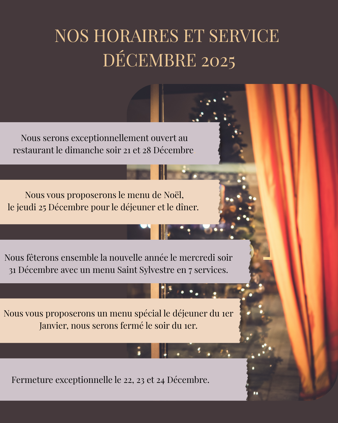 Nous fêterons ensemble la nouvelle année le mercredi soir 31 Décembre avec un menu Saint Sylvestre en 7 services. Le restaurant n'assurera pas le service du déjeuner du 31 Décembre.